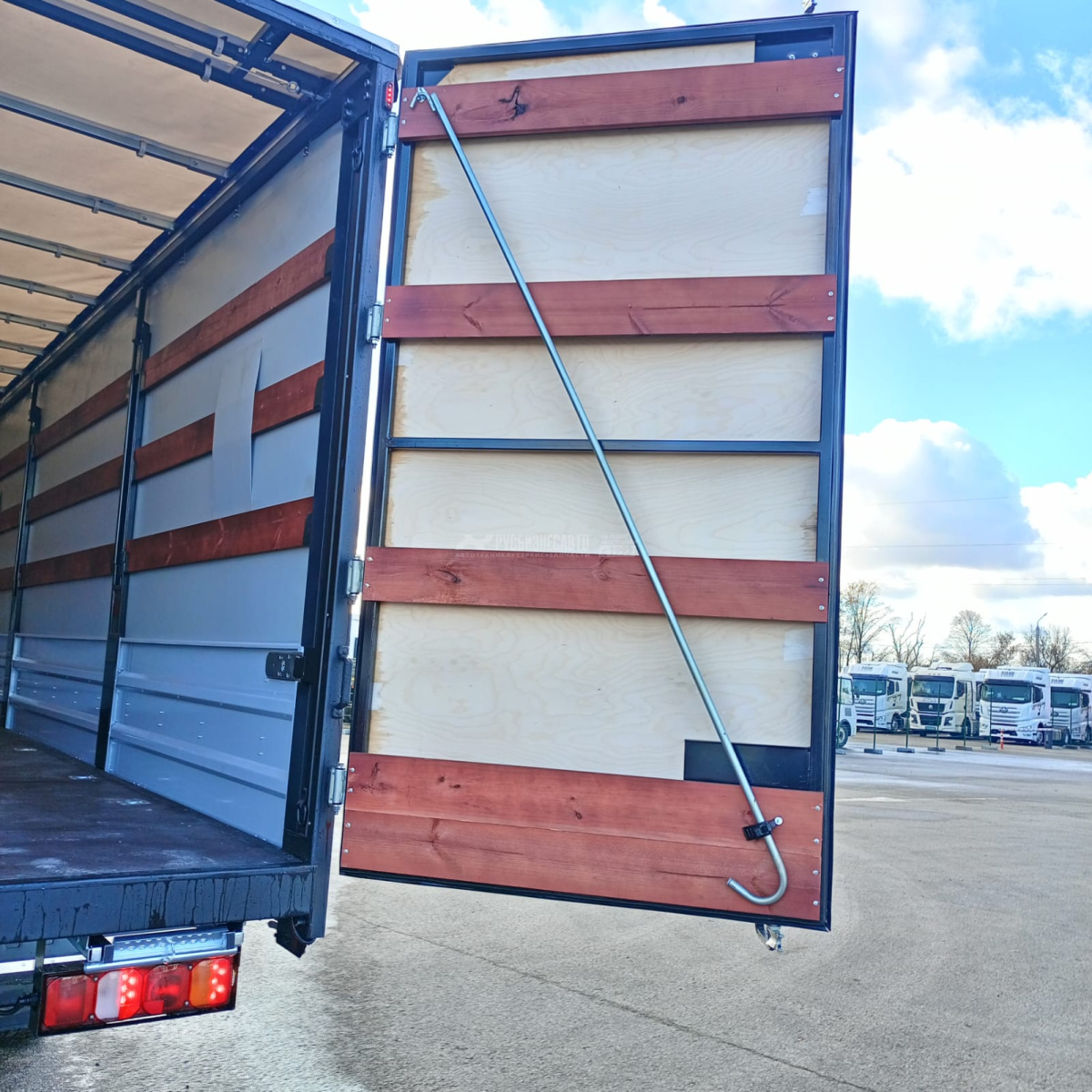 Крыша сдвижная (производство ПРОМТЕНТ) с алюминиевыми направляющими (Ролики с пластинами укладки тента, задняя поперечная балка откидного типа на газонаполненных упорах)